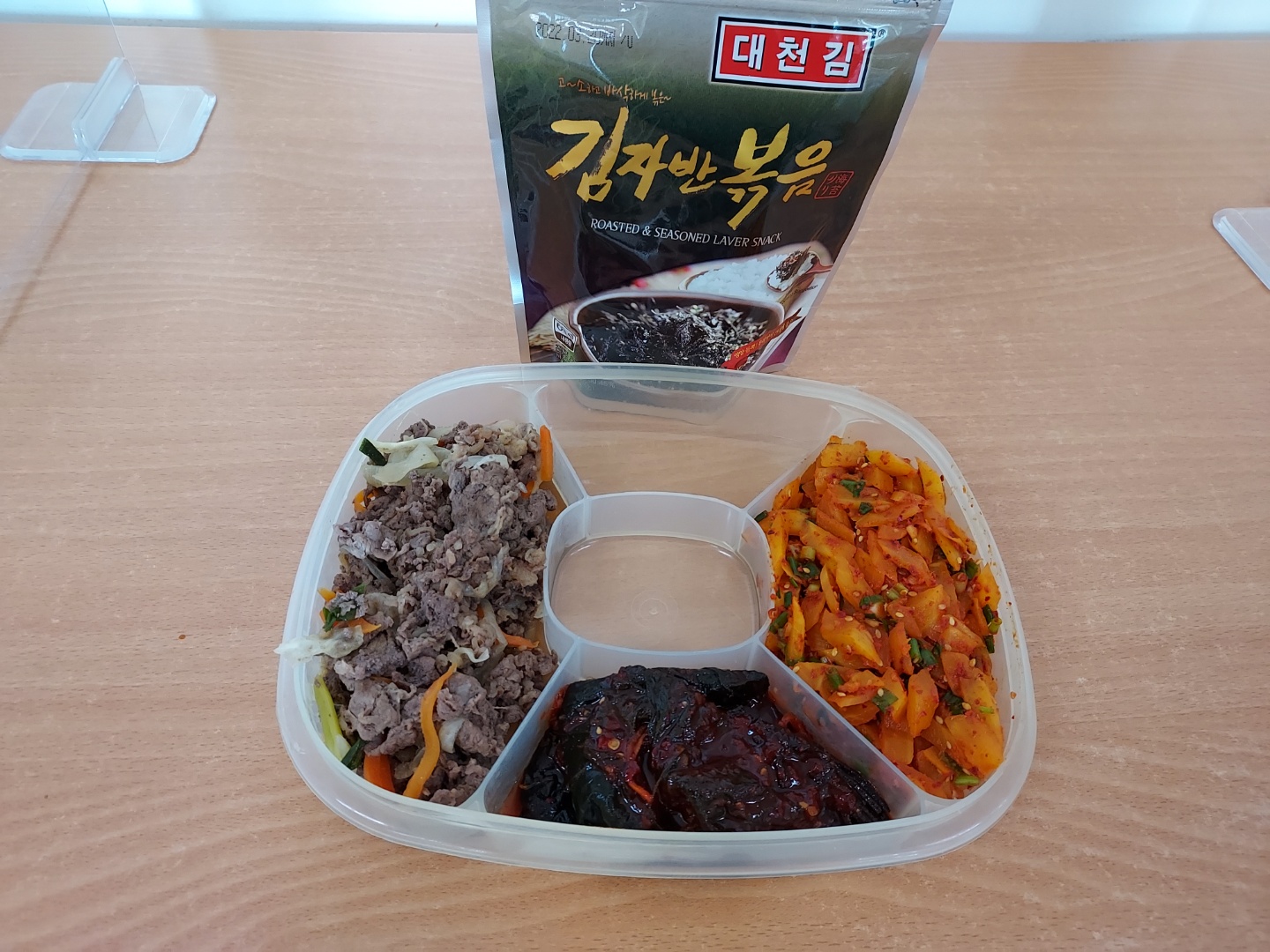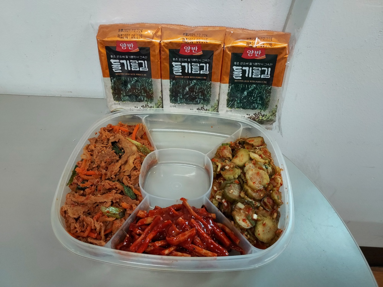 메뉴: 소불고기,단무지무침,깻잎지,김자반