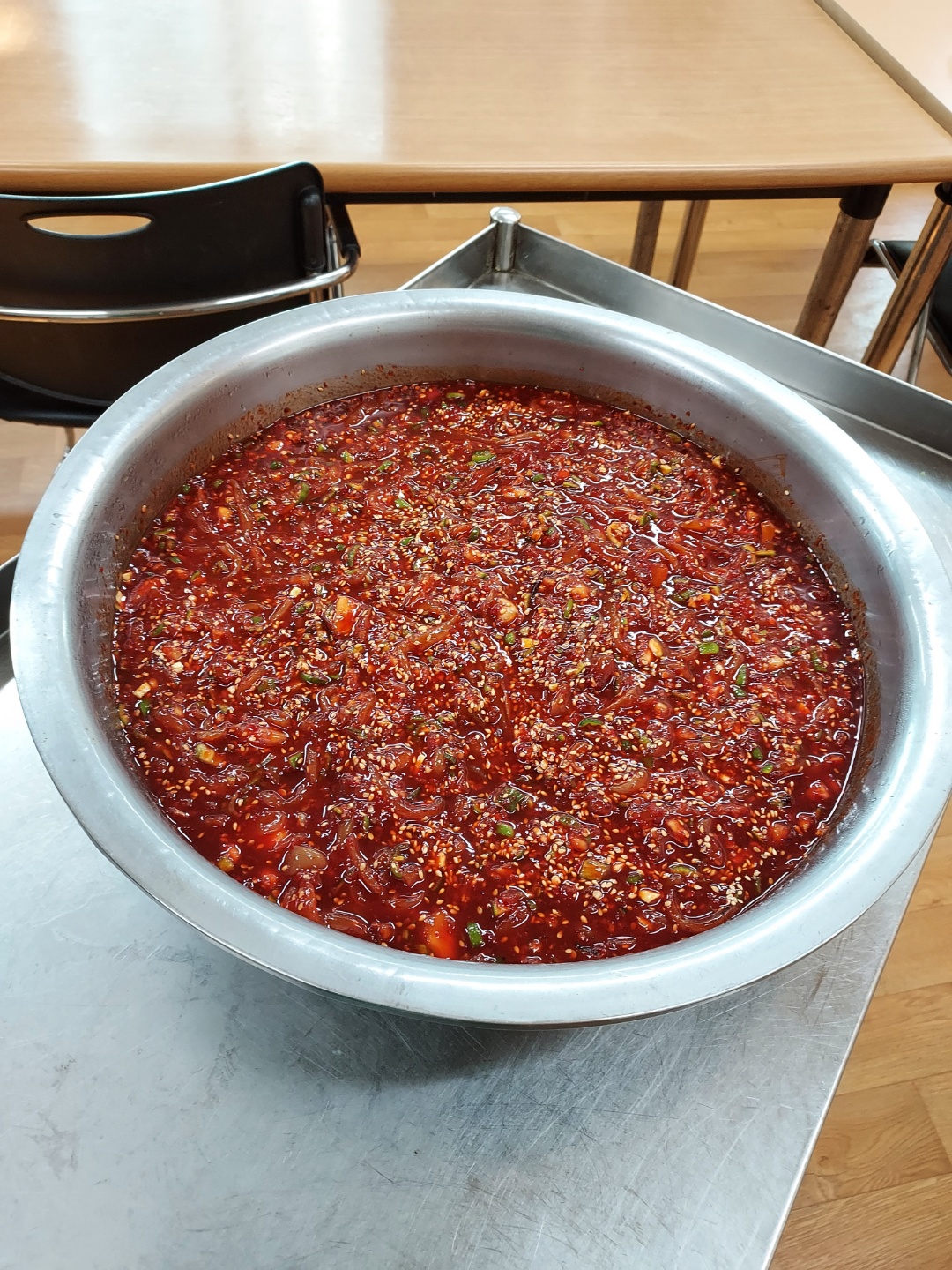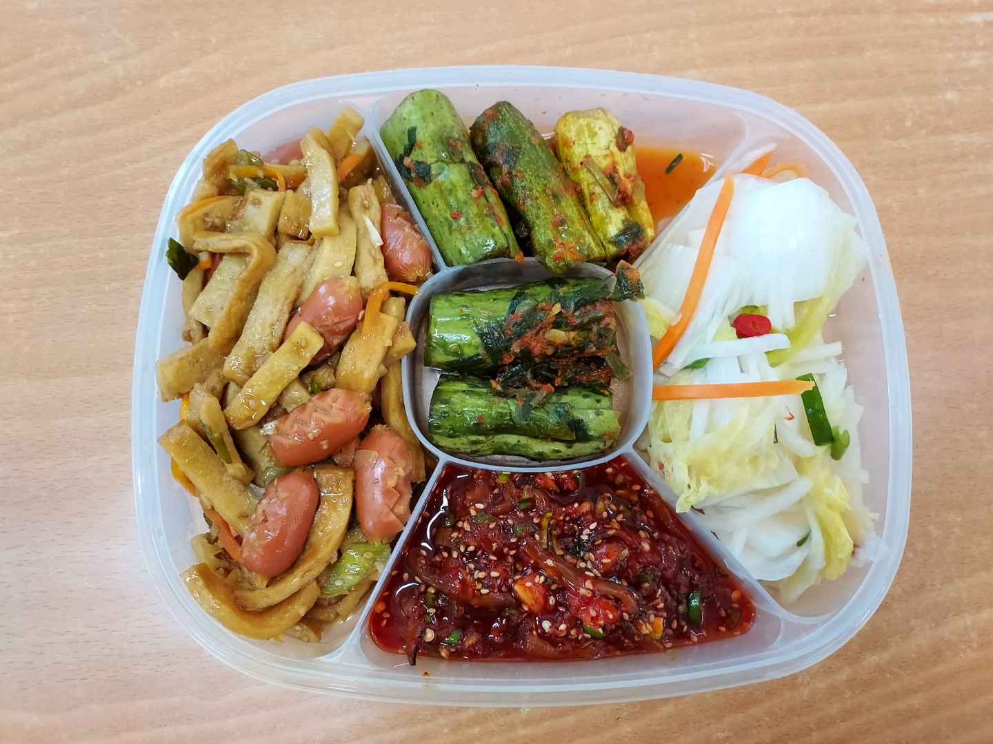 메뉴: 어묵소세지볶음,오이소박이,백김치,오징어젓갈